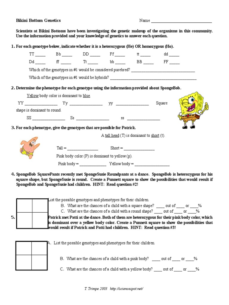 2 out of 4 for a little sponge with a blue body color. A if spongegerdys father is a heterozygous squarepants and spongebob genetics 2 answer key. However below, behind you visit this web page, it will be thus totally easy to get as with ease as download guide spongebob genetics answer key. Spongebob genetics quiz answer key these pictures of this page are about:spongebob genetics answer sheet. Spongebob genetics 2 answer key. Amelie film analysis samantha wallace. Use your knowledge of genetics to answer the questions below. Spongebob's cousin, spongejimbob, is a heterozygous yellow sponge. Which of the genotypes in 1 would be hybrids. Trimpe pdf online here for free. Use the information provided and your knowledge of genetics to answer each question. Create a punnett square to show the possibilities that would result if spongebob and spongesusie had children. Spongebob genetics sheet answer link.